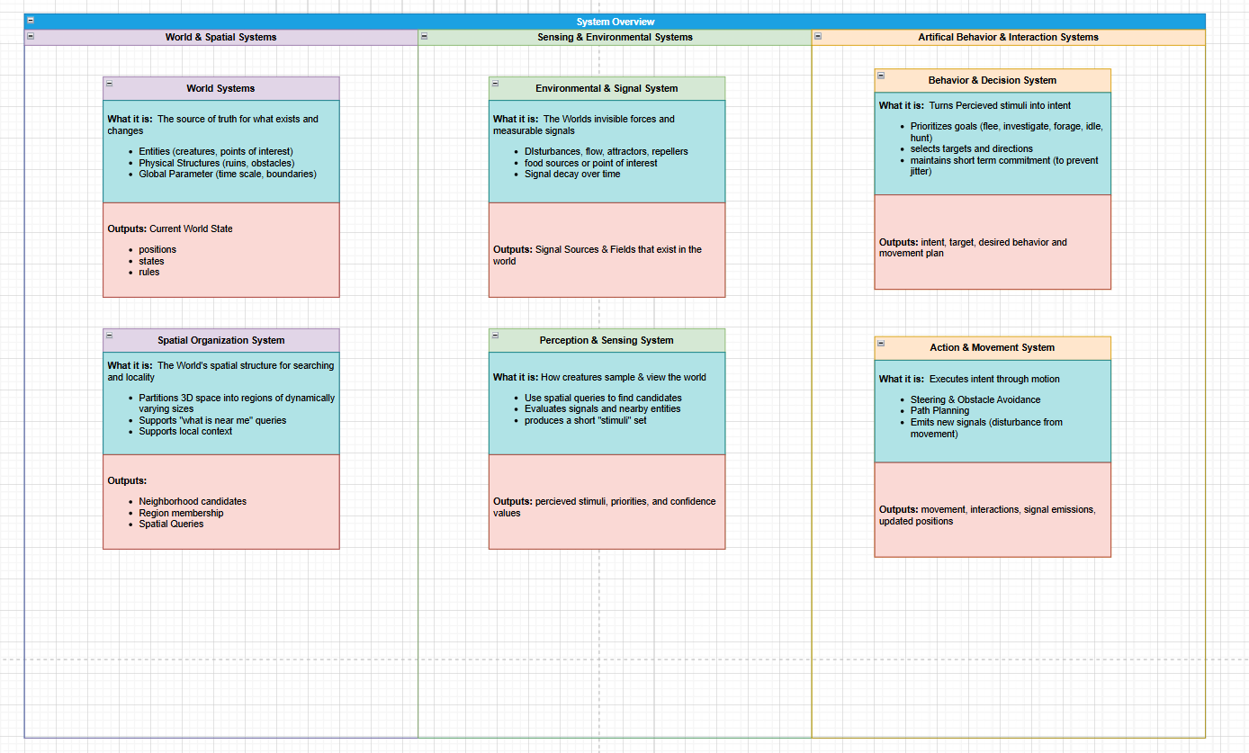 I settled on organizing the simulation into six core systems: World Systems, Spatial Organization System, Environmental & Signal System, Perception & Sensing System, Behavior & Decision System, and Action & Movement System. This structure allows me to separate responsibilities clearly, particularly between world state, spatial logic, perception, and behavior. The Spatial Organization System, which will likely be implemented using an octree, acts as a foundational layer that supports efficient searching, locality awareness, and interaction queries across the entire simulation.
