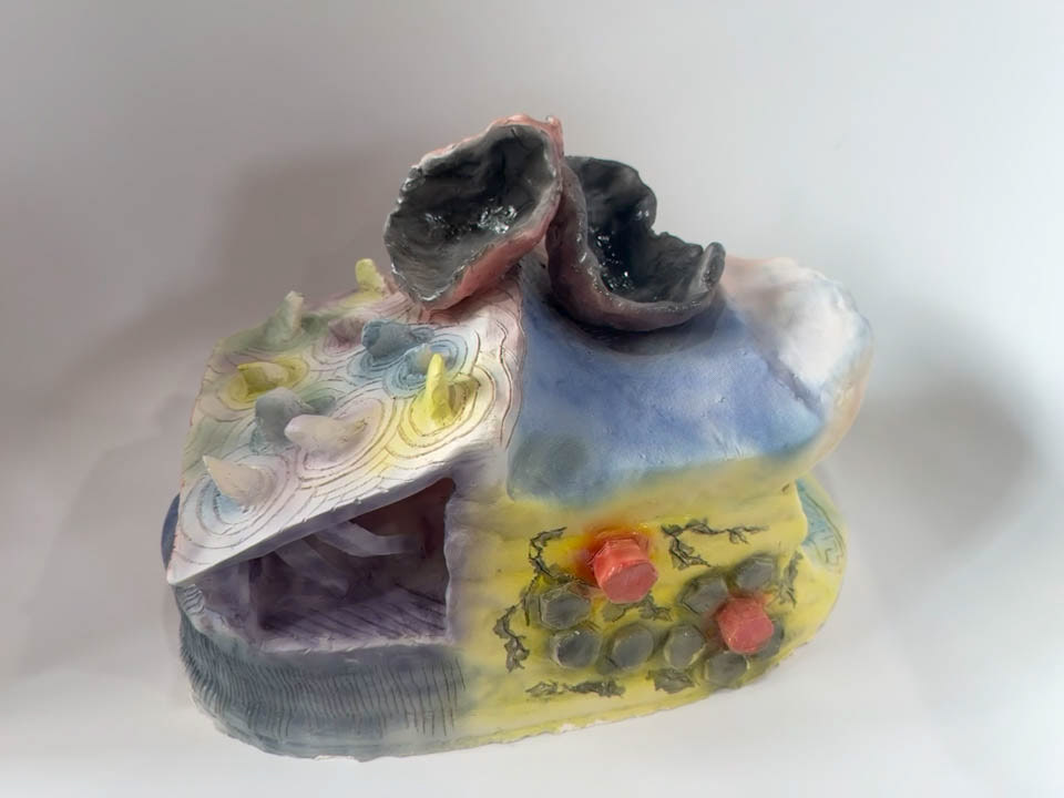 The form holds openings like rooms or cavities, but they aren’t meant to be literal spaces. They’re closer to internal spaces, places that can feel safe one moment and claustrophobic the next. The textures act like signals the brain tries to organize. Patterns repeat, then break. Surfaces shift from smooth to carved. Edges feel controlled until they suddenly don’t. That push and pull is intentional. The work isn’t about labeling conditions. It’s about showing how perception itself can become altered, how the outside world can feel distorted, distant, overwhelming, or strangely bright, even when nothing “out there” has changed.